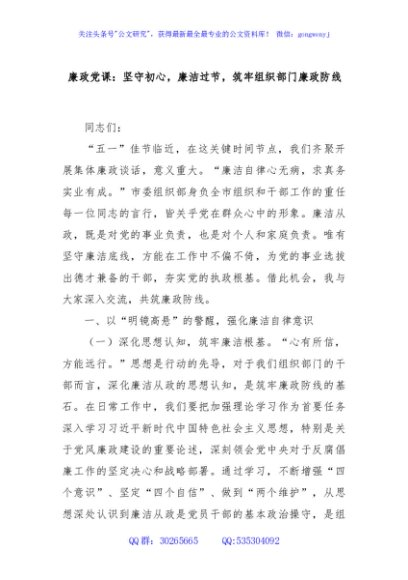 / 廉政党课:坚守初心,廉洁过节,筑牢组织部门廉政防线
