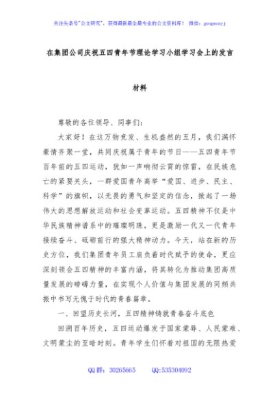 / 在集团公司庆祝五四青年节理论学习小组学习会上的发言材料