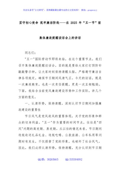 / 坚守初心使命 筑牢廉洁防线——在 2025 年“五一节”前集体廉政提醒谈话会上的讲话