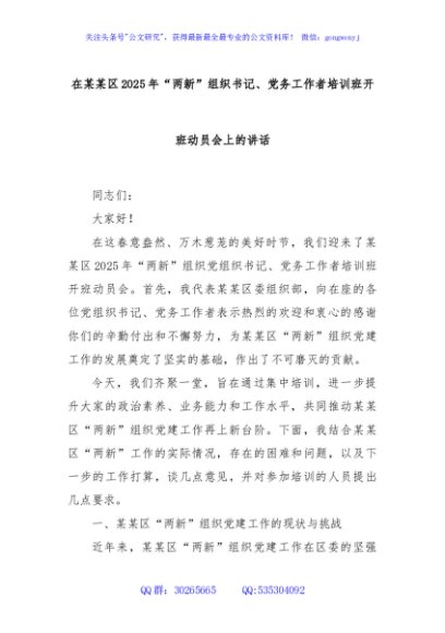 / 在某某区2025年“两新”组织书记、党务工作者培训班开班动员会上的讲话