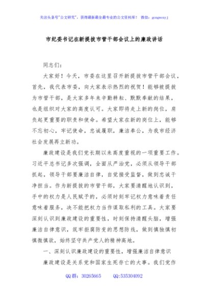 / 市纪委书记在新提拔市管干部会议上的廉政讲话