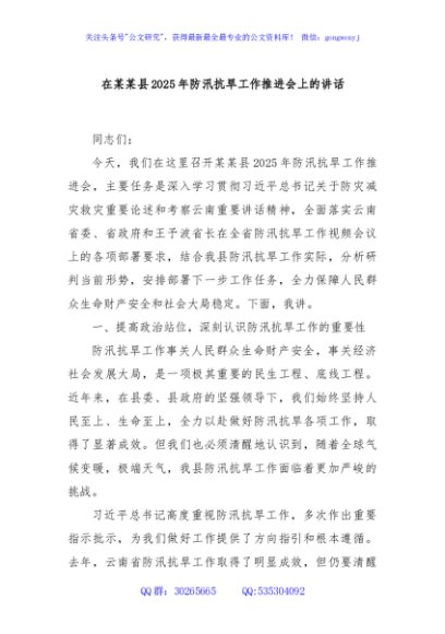 / 在某某县2025年防汛抗旱工作推进会上的讲话