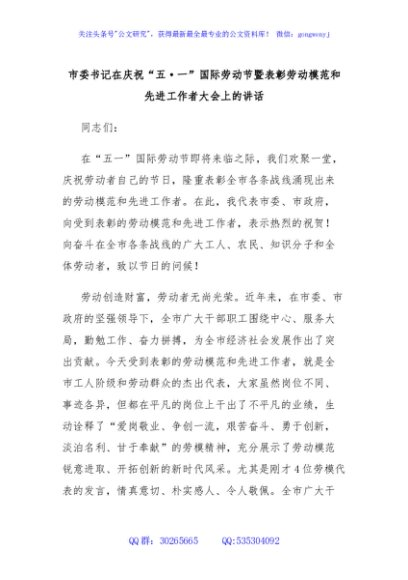 / 市委书记在庆祝“五·一”国际劳动节暨表彰劳动模范和先进工作者大会上的讲话