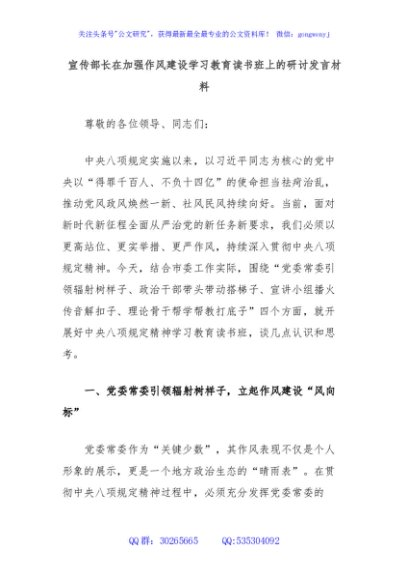 / 宣传部长在加强作风建设学习教育读书班上的研讨发言材料