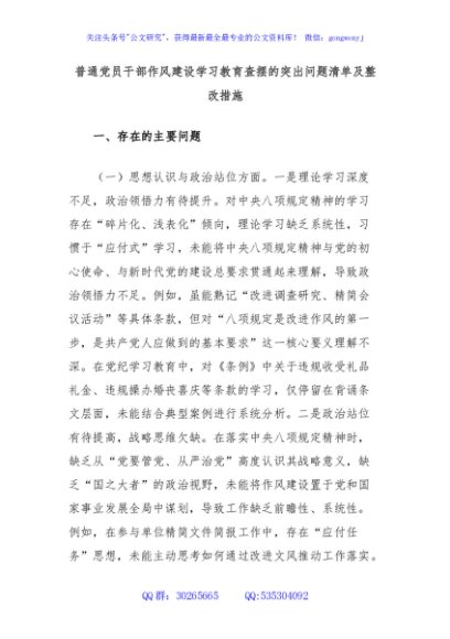 / 普通党员干部作风建设学习教育查摆的突出问题清单及整改措施