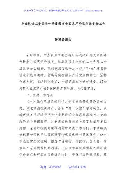 / 市直机关工委关于一季度落实全面从严治党主体责任工作情况的报告