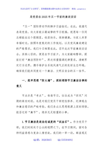 局党委在2025年五一节前的廉政谈话