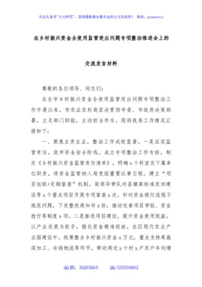 / 在乡村振兴资金全使用监管突出问题专项整治推进会上的交流发言材料