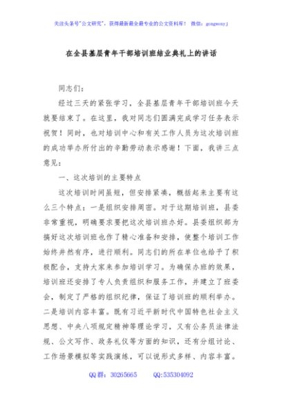 / 在全县基层青年干部培训班结业典礼上的讲话