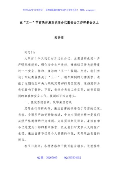 / 在“五一”节前集体廉政谈话会议暨安全工作部署会议上的讲话