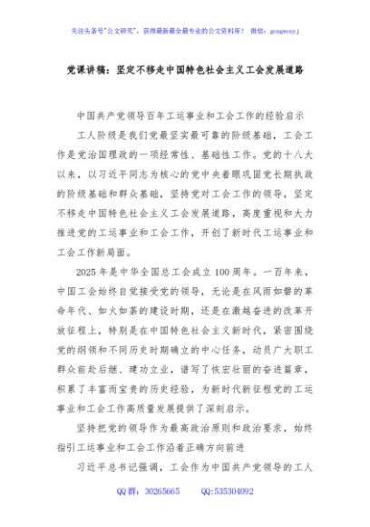 / 党课讲稿:坚定不移走中国特色社会主义工会发展道路