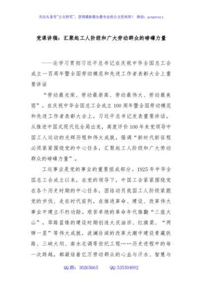 / 党课讲稿:汇聚起工人阶级和广大劳动群众的磅礴力量