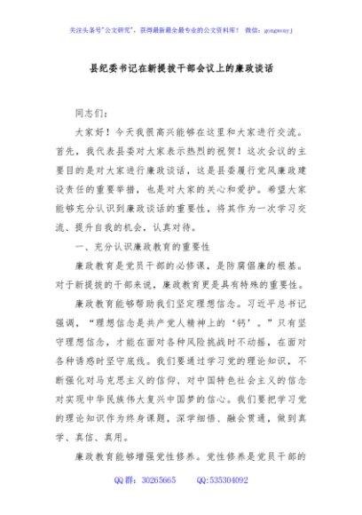 / 县纪委书记在新提拔干部会议上的廉政谈话
