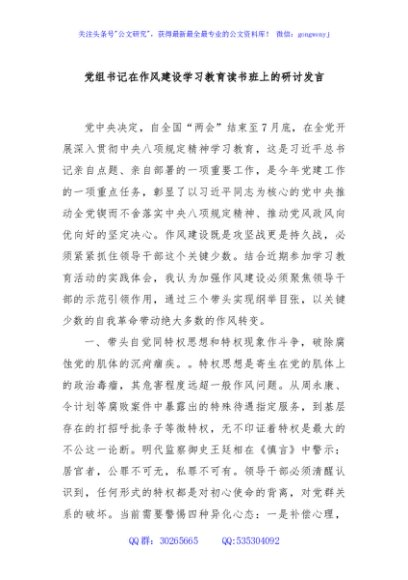 / 党组书记在作风建设学习教育读书班上的研讨发言