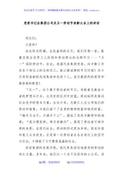 / 党委书记在集团公司庆五一劳动节表彰大会上的讲话