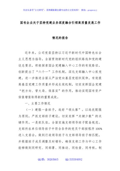 / 国有企业关于坚持党建业务深度融合引领高质量发展工作情况的报告