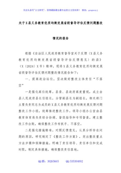 / 关于X县义务教育优质均衡发展省级督导评估反馈问题整改情况的报告