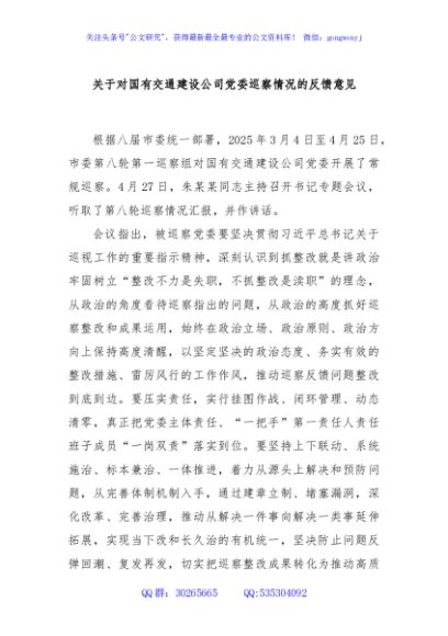 / 关于对国有交通建设公司党委巡察情况的反馈意见