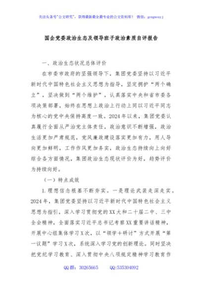/ 国企党委政治生态及领导班子政治素质自评报告