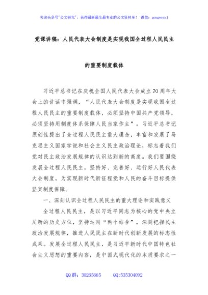 / 党课讲稿:人民代表大会制度是实现我国全过程人民民主的重要制度载体