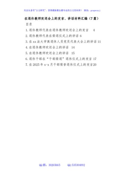/ (7篇)在退休教师欢送会上的发言、讲话材料汇编