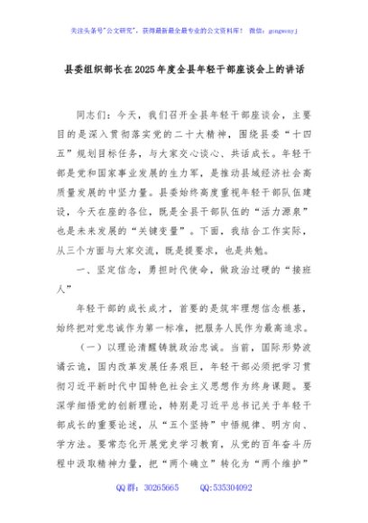 / 县委组织部长在2025年度全县年轻干部座谈会上的讲话