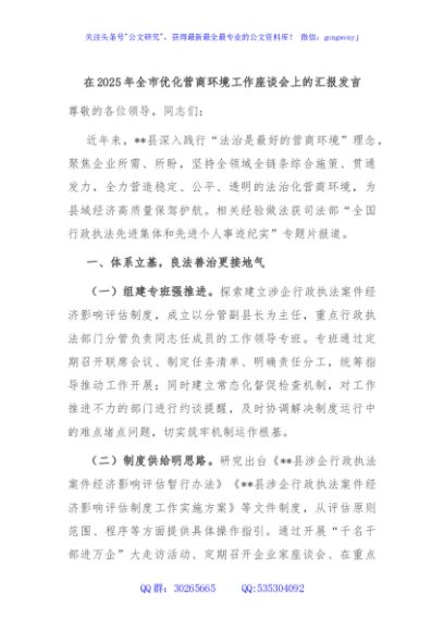 / 在2025年全市优化营商环境工作座谈会上的汇报发言