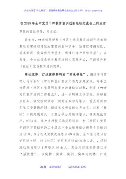 / 在2025年全市党员干部教育培训创新经验交流会上的发言