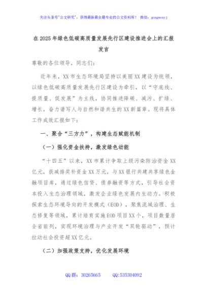 / 在2025年绿色低碳高质量发展先行区建设推进会上的汇报发言