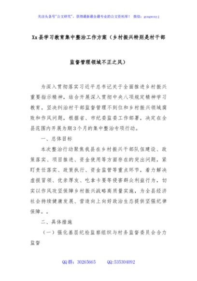 / Xx县学习教育集中整治工作方案(乡村振兴特别是村干部监督管理领域不正之风)