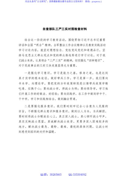 / 自查部队三严三实对照检查材料