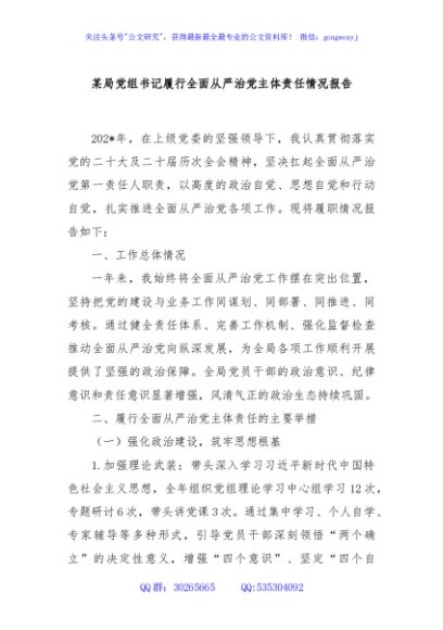 / 某局党组书记履行全面从严治党主体责任情况报告