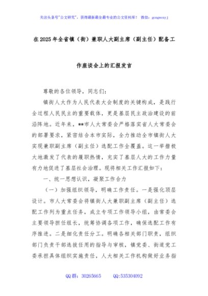 / 在2025年全省镇(街)兼职人大副主席(副主任)配备工作座谈会上的汇报发言