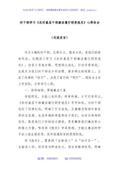 / 村干部学习《农村基层干部廉洁履行职责规定》心得体会(交流发言)