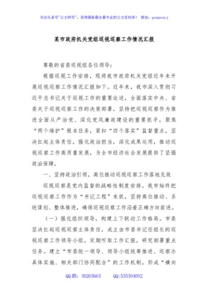 / 某市政府机关党组巡视巡察工作情况汇报