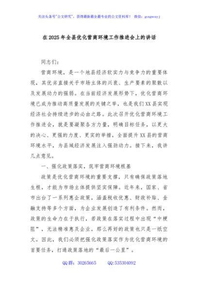 / 在2025年全县优化营商环境工作推进会上的讲话