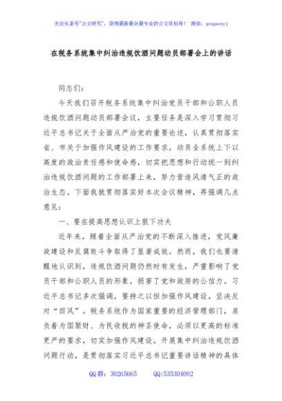 / 在税务系统集中纠治违规饮酒问题动员部署会上的讲话