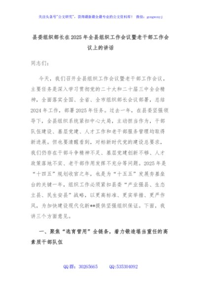 / 县委组织部长在2025年全县组织工作会议暨老干部工作会议上的讲话