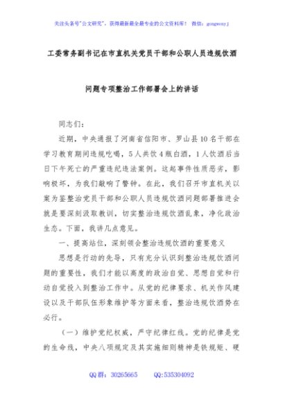 / 工委常务副书记在市直机关党员干部和公职人员违规饮酒问题专项整治工作部署会上的讲话