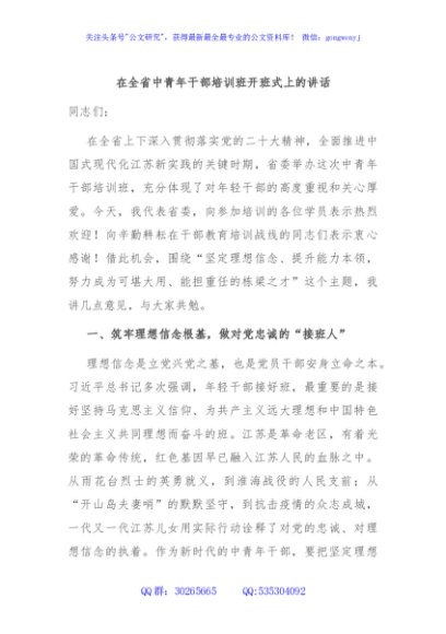 / 在全省中青年干部培训班开班式上的讲话