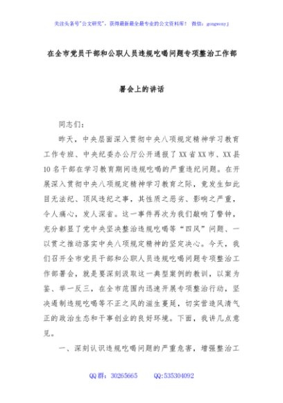 / 在全市党员干部和公职人员违规吃喝问题专项整治工作部署会上的讲话