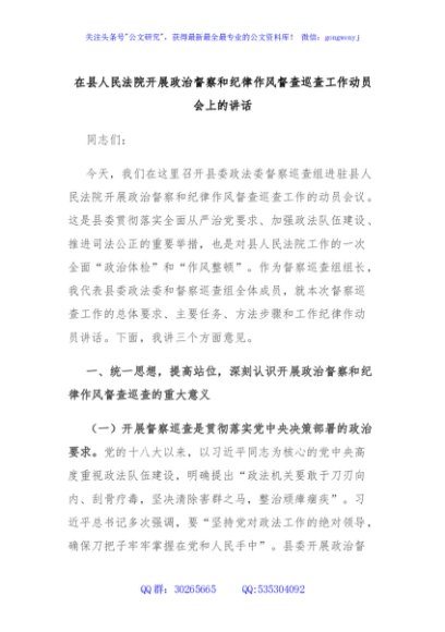 / 在县人民法院开展政治督察和纪律作风督查巡查工作动员会上的讲话