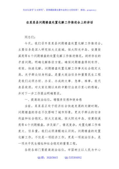 / 在某某县问题楼盘处置化解工作推进会上的讲话