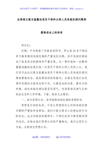 / 在街道以案为鉴整治党员干部和公职人员违规饮酒问题部署推进会上的讲话