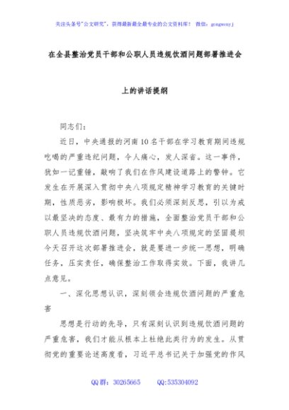 / 在全县整治党员干部和公职人员违规饮酒问题部署推进会上的讲话提纲