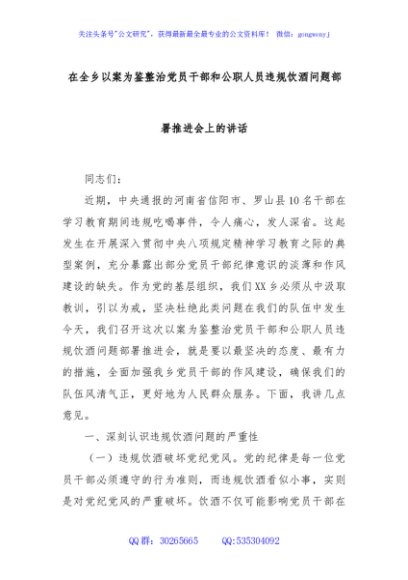 / 在全乡以案为鉴整治党员干部和公职人员违规饮酒问题部署推进会上的讲话