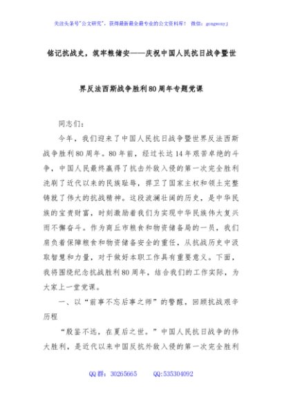 / 铭记抗战史,筑牢粮储安——庆祝中国人民抗日战争暨世界反法西斯战争胜利80周年专题党课