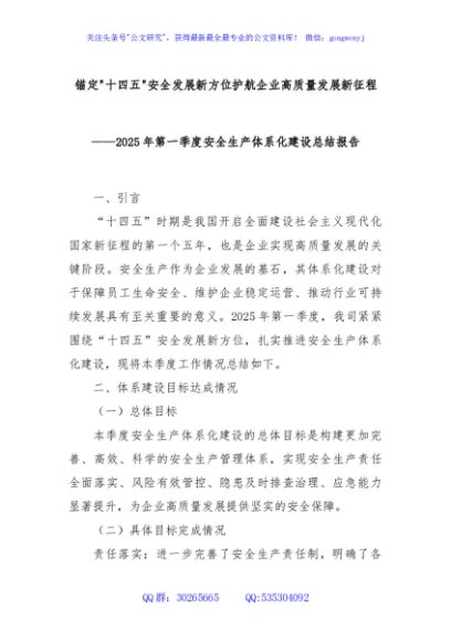 / 锚定十四五安全发展新方位护航企业高质量发展新征程——2025年第一季度安全生产体系化建设总结报告
