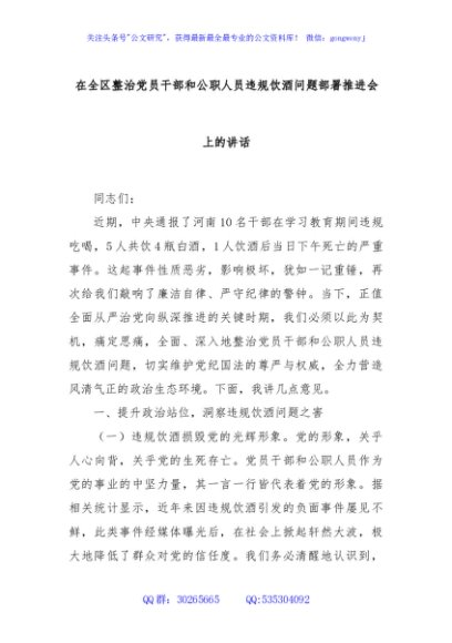 / 在全区整治党员干部和公职人员违规饮酒问题部署推进会上的讲话