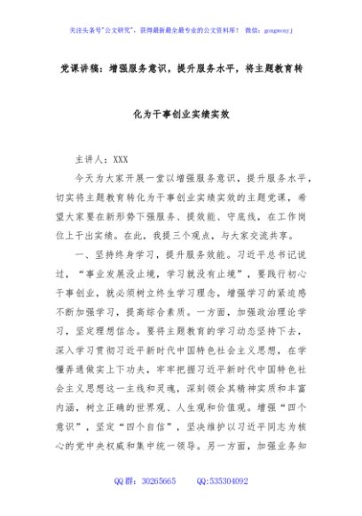 / 党课讲稿:增强服务意识,提升服务水平,将主题教育转化为干事创业实绩实效